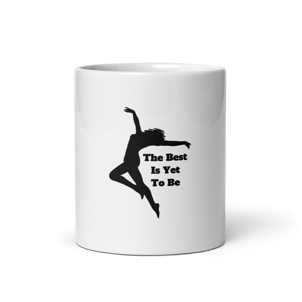 Why the leaping lady? It's about finding joy in life. This slogan is taken from my church, and it's all about finding joy in your life. Get your white coffee mug and show the world "the best is yet to be." This sturdy mug is perfect for your morning coffee, afternoon tea, or whatever hot beverage you enjoy. It's glossy white and yields vivid prints that retain their quality when dish-washed and microwaved. Dishwasher and microwave safe. Ceramic.